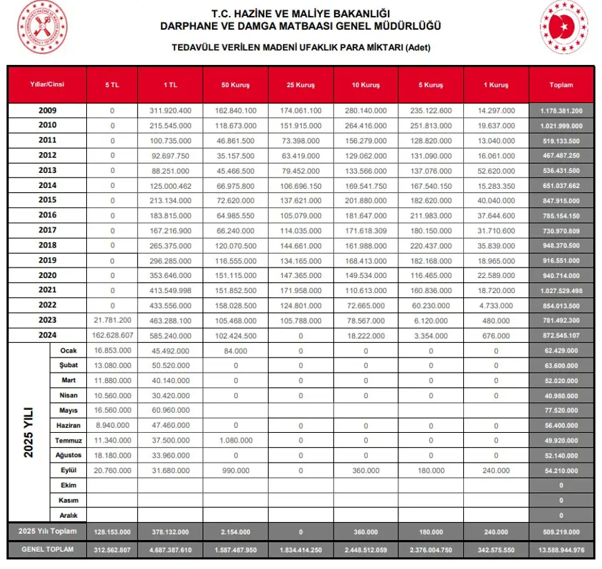 Darphane’nin yayımladığı yıl içi verilere göre, 2025 yılında toplam 509 milyon 219 bin liralık madeni ufaklık para basımı gerçekleştirildi. Bu rakam, önceki yıllara kıyasla daha sınırlı bir üretime işaret ediyor.