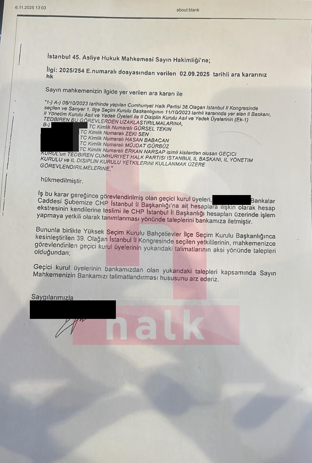 Banka bu başvurunun ardından Tekin’i kayyum olarak atayan 45’inci Asliye Hukuk Mahkemesi’ne yazı yazdı. Söz konusu yazıda mahkemenin Tekin’i İl Başkanı olarak görevlendirdiği ancak son kongrede Özgür Çelik’in seçildiği, seçilen yönetimin de Tekin’in aksi yönünde talebi olduğu belirtildi.